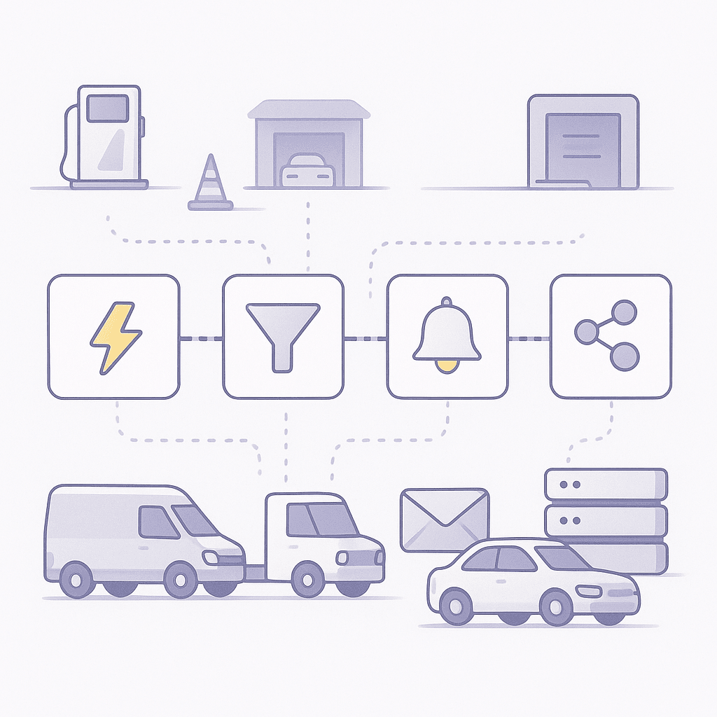 Create automations for inspections, fuel anomalies, service schedules, documents, work orders, and more. Route the right update to the right person by email, WhatsApp, or webhook in seconds.